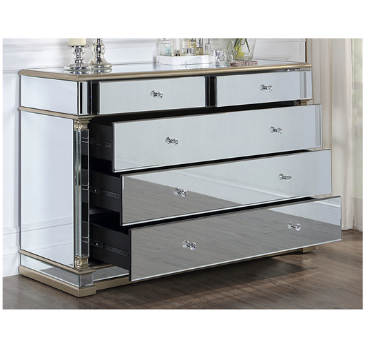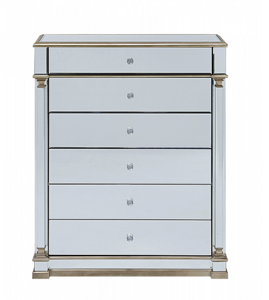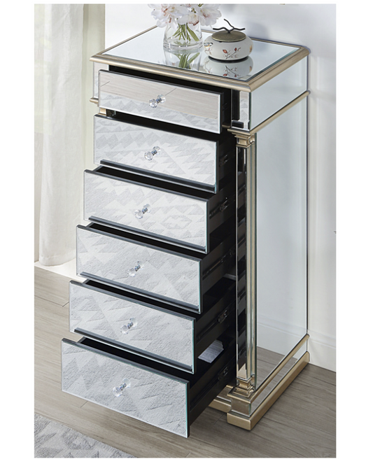Athena Mirrored Tallboy 5 Drawers Antique Brushed Silver Wood Frame Crystal Handle