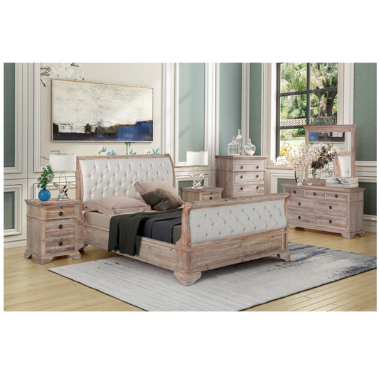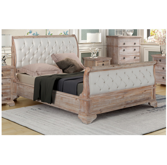 IBIZA Sleigh Bed Tufted Upholstered Headboard Footboard Acacia Wood - A