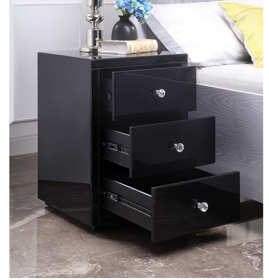 VEGAS Black Glass Bedside Table 3 Drawer with Crystal Effect Handle