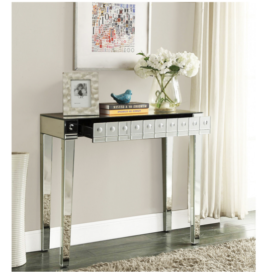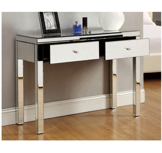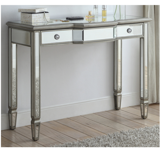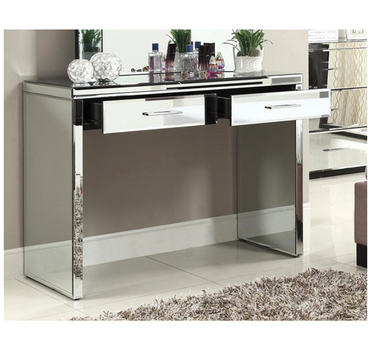 Celebrate the allure of reflection with our exquisite mirrored console/dressing tables, where functionality meets elegance in a harmonious dance of sophistication. Each piece is a testament to meticulous craftsmanship, as the mirrors seamlessly meld with sleek lines, creating a timeless and enchanting aesthetic. The reflective surfaces not only amplify the surrounding space but also serve as a canvas for the play of light, casting a mesmerizing glow that transforms any room into a sanctuary of glamour. Whether used as a statement entryway piece or a luxurious dressing table, these mirrored wonders elevate your space to new heights of opulence. The attention to detail is unparalleled, with carefully arranged mirrored panels capturing and refracting the beauty of your surroundings. Immerse yourself in the glamour and allure of our mirrored console/dressing tables — where every reflection becomes a work of art, and functionality meets unparalleled style in a celebration of modern design.