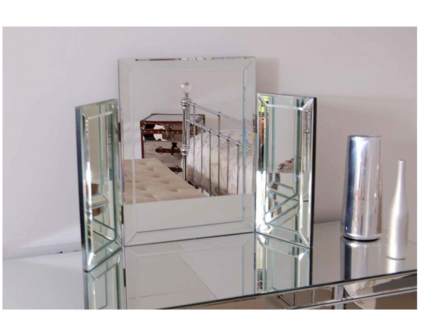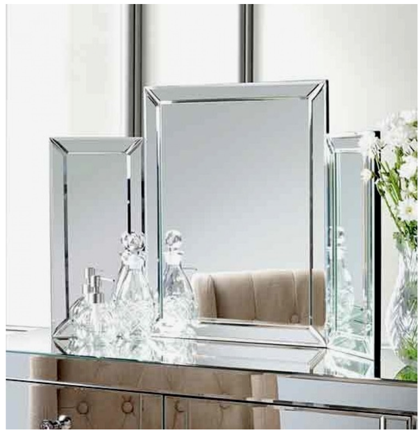 - Add a touch of luxury to your dressing table with the Colleta Tri Fold Vanity Mirror. This free-standing mirror has been designed with two small brackets on the rear to help prevent it from falling when opened. With a height of 60cm and width of 80cm, this stylish mirror offers a clear reflection with its 1.6cm depth.