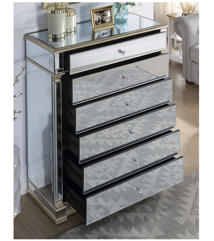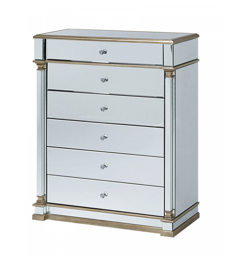 - Constructed to a high quality specification, this dazzling piece of mirrored furniture has smooth metal runner drawers, finished with glamorous crystal effect handles.