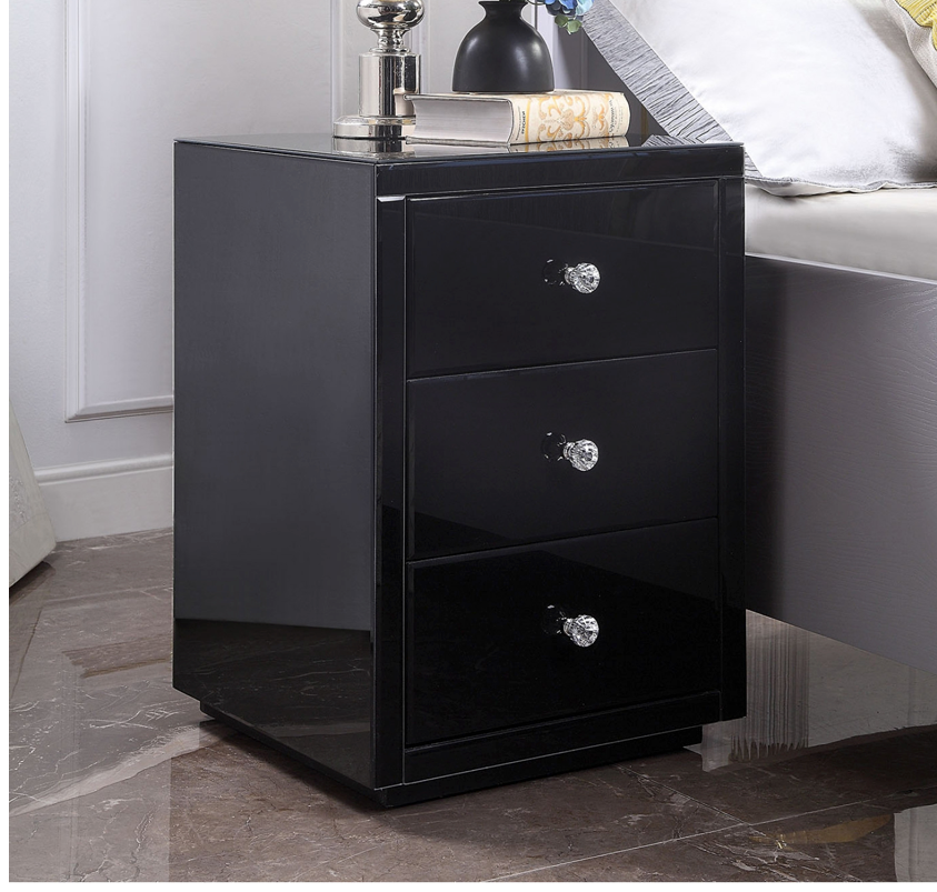 - This Art Deco inspired, contemporary Black Glass Mirror 3 drawer Bedside Table Nightstand reflects light beautifully, making it an elegant, and practical bedside table to suit any bedroom. If you are looking for that Hollywood wow factor when you walk into the room, this mirrored furniture range is sure to please.